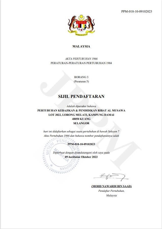 The registration was approved and signed on 9th October 2023, symbolizing our lawful status and dedication to the development of Islamic education in Malaysia.